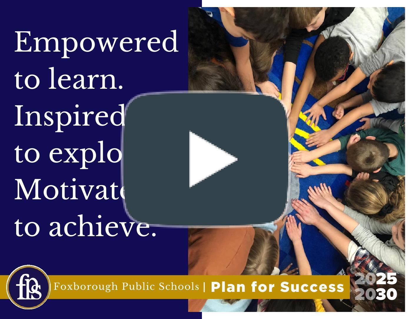 We are excited to share the Foxborough Public Schools 2025–2030 Plan for Success, a comprehensive roadmap that will guide our vision for the next five years. This plan was developed through a collaborative process that engaged the voices of students, parents and guardians, educators, staff, administrators, and community members. Your voices shaped this plan, and your commitment to our students and schools has been invaluable.